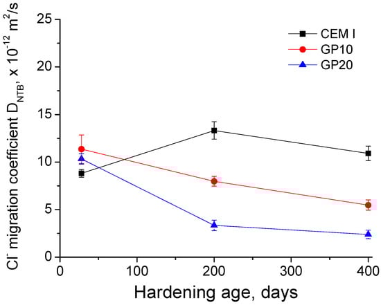 The changes with time of the non-steady-state chloride migration coefficient DNTB for the analysed mortars can be observed in Figure 16. This parameter kept practically constant for CEM I mortars, and decreased with age for those with glass powder addition, especially from 28 to 200 days. At 28 days, the migration coefficient was similar for all the studied mortars. Nevertheless, at 200 and 400 days it was lower for glass powder mortars, mainly for GP20 ones.