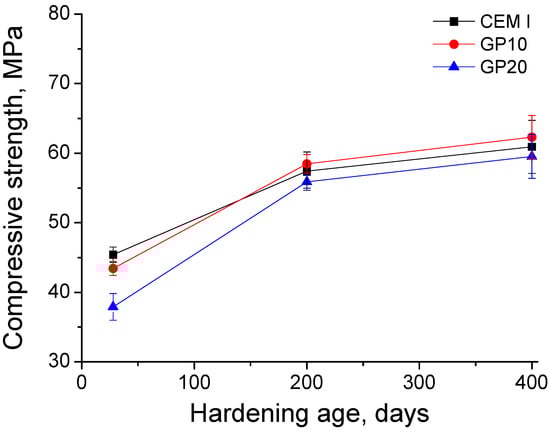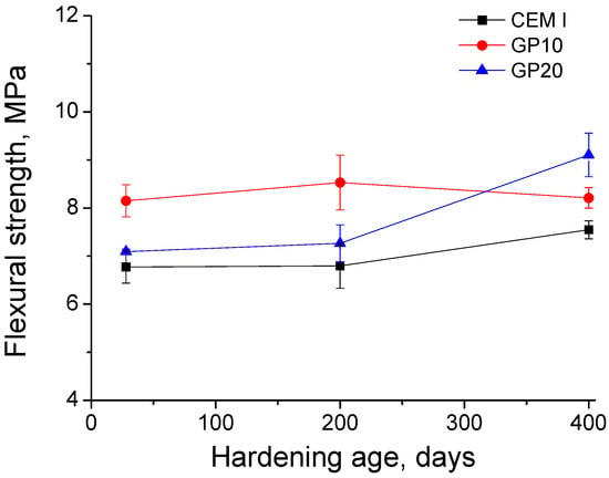 The results of compressive and flexural strengths noted for the analysed mortars are shown in Figure 17 and Figure 18, respectively. The compressive strength rose with hardening age for all the studied mortars, especially between 28 and 200 days. The lowest values of this parameter at 28 days were observed for GP20 mortars, despite that the compressive strength was very similar for all the studied samples at 200 and 400 hardening days. On the other hand, the flexural strength hardly changed throughout the 400-day period, and was slightly greater for mortars with glass powder compared to CEM I ones.