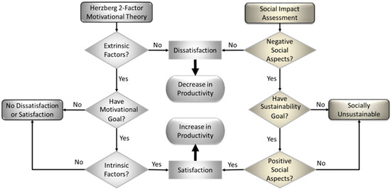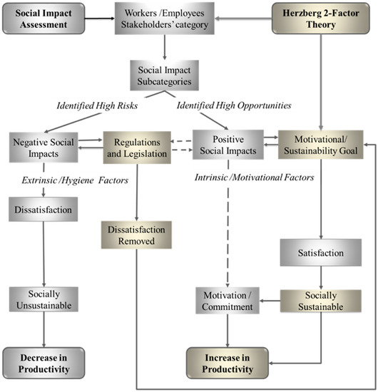 The hygiene or extrinsic factors are considered to have high risks of negative impacts on the employees and the organisation [44]. This is because the absence of extrinsic factors gives rise to employees’ dissatisfaction and eventual high employees’ turnover rate or low productivity [20]. These factors are often called the “maintenance factors” and their existence is paramount to create a safe and favourable working condition. The presence of the factors is also responsible for the removal of unpleasant feelings or reactions that might give rise to the employees’ dissatisfaction. Though their supply does not bring any sense of satisfaction for the employees [43,45], organisations are unable to stimulate any motivational strategy in the absence of these maintenance factors. In parallel with the SIA, the absence of negative social aspects (i.e., factors which absence impacts negatively on the employees’ safety and well-being) gives rise to dissatisfaction, social instability, and lack of commitments from the employees. In the absence of the negative social impacts, an organisation is unable to stimulate any social initiative or sustainability strategy that could give rise to job satisfaction and productivity. Figure 3 depicts how these two phenomena are aligned in similarities. Organisations with motivational goals will initiate the supplies of intrinsic factors to increase employees’ satisfaction and productivity. Similarly, organisations with social sustainability goals will increase the supplies of positive social aspects to drive social sustainability and increase productivity.