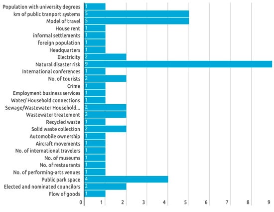 Out of the 41 UDCI, only 27 were found referenced as urban factors affecting the conservation of WHC. The list of UDCI was adapted to 52 keywords using the possibility of expressing indicators as urban factors as defined by the UNESCO list of threats (Figure 2). For instance, the UDCI natural disaster risk has the highest number of keywords (nine): earthquake (25 references), flood (17 references), and fire (20 references) being the urban factor most frequently referenced. Modes of transport and Kilometers of public transport follow, both with five related keywords. The first includes transport system (five references), and the word “transport”, followed by node, network, and center (1 reference each). The second includes the following keywords: extension (seven references), connection (three references), and expansion (one reference). Next, comes the factor Public park space, with four keywords: park (16 references), green area (nine references), green space (four references), and public garden (one reference). Other UDCI, such as elected councilors, were not found with their original description but rather with context-related keywords such as political (25 references) and elections (one reference). For instance, “some deficiencies have been identified in the existing legislative framework, especially in four areas … Public management of the site has to be made more stable, and less dependent on political cycles”. In this example, the interpretation of the reference is that political cycles or the process of electing/changing councilors are identified as external factors affecting the management of a site. The list of UDCI and the number of related keywords is shown in Figure 3.