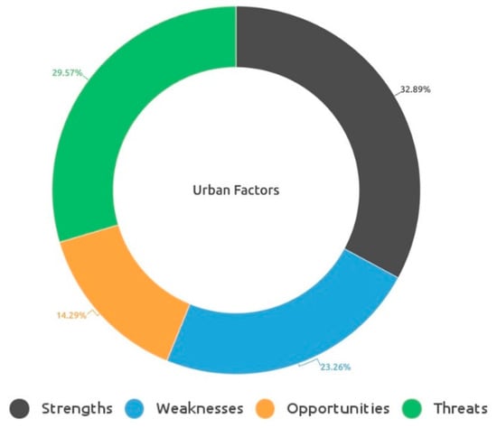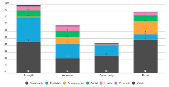 Some trends were observed in correlation with sustainability dimensions and the SWOT analysis. When discussing internal factors, a plurality of strengths (45%) are discussed in terms of sustainability, but references tend to prioritize the economic and social dimensions (39% equitable and 9% social dimensions). Strengths are the category with the fewest urban factors discussing the environmental dimension (1% environmental, 3.5% livable, and 2% viable dimensions). Weaknesses have a higher share of references discussing the equitable impacts of urban factors (36%) than in sustainable terms (30%). Environmental factors constitute 14% of the references, and they have the highest share of all the SWOT categories on livable-related factors (9%), but viable factors only make up 1% of the total.