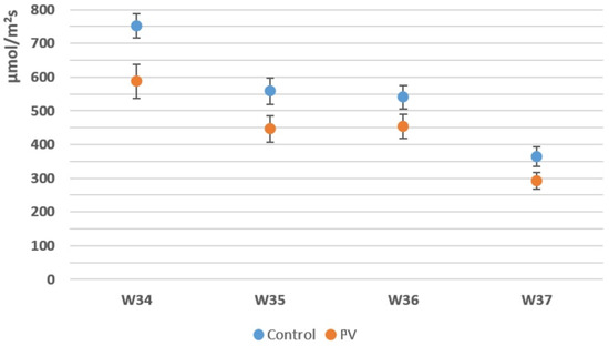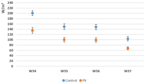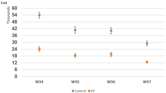 - the amount of incident light per unit area is about two times higher under the control area compared to the PV treated area;