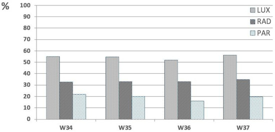 - the total radiation (RAD) and the PAR were reduced of about 30% and 20% respectively under PV treatment.
