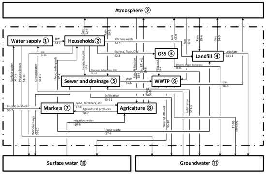 - Yiougo, L.; Koanda, H.; Luethi, C.; Wéthé, J. Application of the material flow analysis method for evaluating strategic sanitation plan in Sub-Saharan Africa: The case of Fada N’Gourma-Burkina Faso. Water Sci. Technol. 2011, 63, 2498–2504. [Google Scholar] [CrossRef] [PubMed]