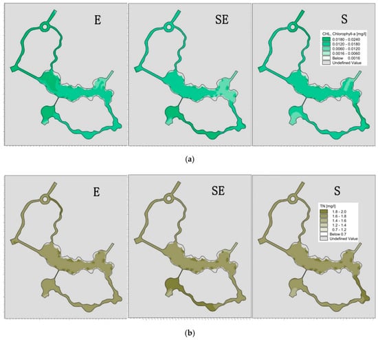 The distribution of Chl-a, TN and TP in Playground Lake were obtained after the model reached a fully stable state [38,39,40,41], as shown in the Figure 10a–c. The comprehensive score of the eutrophication assessment is shown in Figure 10d. The results showed that: ① The concentrations of Chl-a, TN and TP and the comprehensive score of eutrophication assessment in three wind directions were 0.014 mg/L, 1.49 mg/L, 0.11 mg/L and 58.0, respectively. With no water diversion and in three kinds of wind field, the water of the Shuijie area, Moya area and the outlet area connected with the culvert cannot be effectively replaced, which was consistent with the flow field. Water retention led to higher Chl-a, TN and TP contents. ② In the case of no water diversion and the east wind, as the wind direction was perpendicular to the #1, #2 and #3 sections of Shuijie, the contents of Chl-a, TN and TP in the water body in this area were higher than those under the other two wind directions. Under the east and southeast winds, the contents of Chl-a, TN and TP in the water body in the central landscape lake were higher than that under the south wind, because the water was more affected by the inflow from #2 sluice in the first two wind directions, which improved the water quality of the central landscape lake. While affected by the inflow of the outlet, the water quality in the outlet area was the best under the south wind, followed by the southeast wind and finally the east wind.