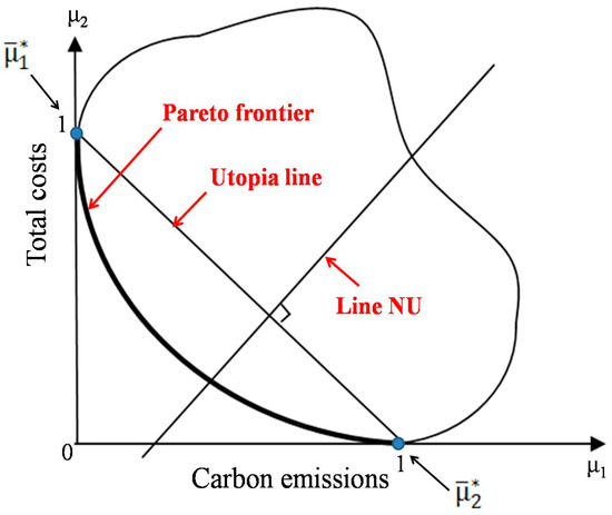 The Utopia line is defined based on Formula (21), which shows the direction for obtaining the Pareto frontier, as shown in Figure 2: