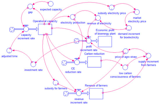 After obtaining the optimal supply chain structure by using the multi-objective programming model, this study designed external motivational mechanisms to facilitate its effective operation with the aid of system dynamics. It is a method for simulating the time-varying behavior and feedback mechanisms in complex systems using system modeling and dynamic simulation [32]. The straw biomass supply chain in this study can be deemed as a complex dynamic system. Upon the introduction of government motivation measures, complex interaction among the interests of main supply chain stakeholders, including the power plants, farmers, and residents, influences the operation of the supply chain. Therefore, this study attempts to divide the supply chain under the influence of government subsidy into three sub-systems: (1) those of residents’ electricity consumption; (2) farmers’ straw supply; and (3) electricity production. The key relationships involved in the three sub-systems are based upon common consensus, and mainly derived from the existing studies. For example, increase of installed capacity may give rise to a growth of revenue of power plants [33]. This study further restructures these relationships to formulate the specific causal loop diagrams as follows: