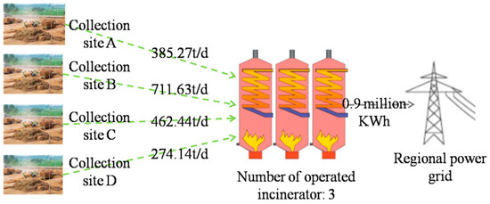 In the above formulae, denotes the straw collection cost, which is proportional to the straw collection volume to the 1.5th power [30]; is the transportation cost; is the storage cost; represents the cost of electricity generation, which consists of the operation costs of incinerators and generator sets as well as the cost of exhaust gas processing; and denotes the operation and maintenance cost, which is related to the capacity of the installed incinerators.