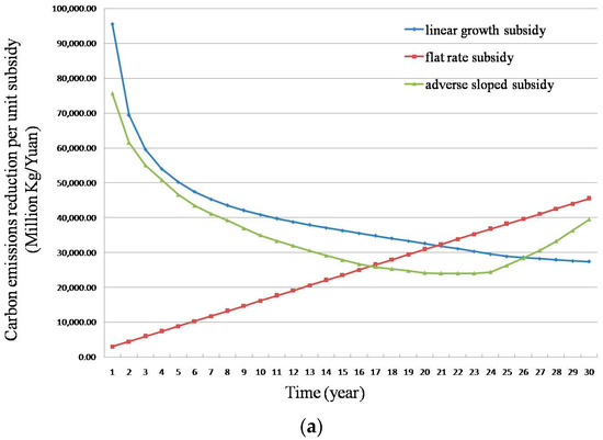 For the sake of both the supply chain stakeholders and the government return, this study selected the carbon emissions reduction per unit subsidy as the observation indicator to identify the optimal subsidy mechanism. Figure 8 illustrates the carbon emissions reduction per unit subsidy for the bio-energy plant and farmers. It is evident in Figure 8a,b that the flat rate subsidy is least effective in emissions reduction at the onset of the motivation scheme, but it surpasses the other two gradually around the twentieth year. In contrast, the linear growth and the adverse sloped are more effective in emissions reduction at the onset, but their performances decline after the fourth year. Overall, during the prediction cycle of thirty years, the linear growth subsidy is the most effective in emissions reduction.