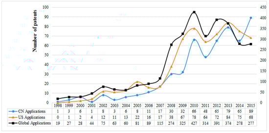 The analysis of annual distributions or changes of patent applications could help us understand the development trends of a specific technological sector [25]. Figure 2 presents the time series of patent application for CCS technology in China, the United States and the world. It can be seen that the numbers of patents for CCS technology in the United States had been increasing since 2002 and reached a peak in 2013, while in China, they have been increasing since 2007 and experienced a sharp increase since 2015. In 2005, a special report on the CCS technology was published by IPCC, this report not only is an extremely valuable and detailed reference document [26] but also is regarded as the most important milestones for CCS technology [27]. Furthermore, both the CoP 11 in Montreal and the first National Conference on CCS technology in The Netherlands were also held in 2005, the projects and plants for CCS implementation became more concrete during the period of time between 2005 and 2006 [28]. These facts/events may contribute to the rapid growth of patent applications of CCS technology after 2006.