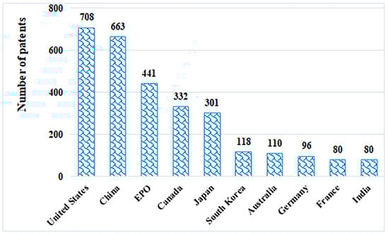 The geographical distribution of patents reflects the different intensity of R&D and market competition in different countries and region [34]. Figure 3 illustrates the top 10 countries and region of patent applications in the field of global CCS technology. It is found that the United States has the largest number of CCS patent applications (708). Apart from the U.S., extensive patent applications are seen in countries or region like China (663), European Patent Office (EPO, 441), Canada (332) and Japan (301). Among the top 10 countries for CCS patent applications, there are four countries from Asia, three countries or regions from Europe and two countries from North America.