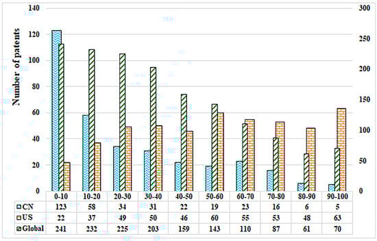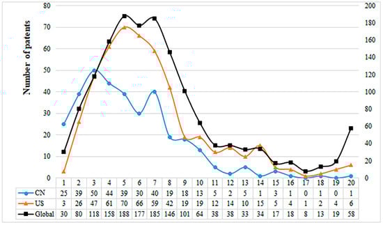 Therefore, the number of claims can be used as an indicator of patent quality [42]. The more patent claims might mean more technological features and a more complicated technological solution, as well as being less likely to be completely invalidated. The numerical distributions of claims of CCS patents in China and the U.S. are shown in Table 4. The average number of patent claims in the U.S. is 19. However, it is just nine in China, which is far below the global average number. There are many patents which have 20 claims in the U.S., by contrast, there is a large number of patents with only four claims in China.