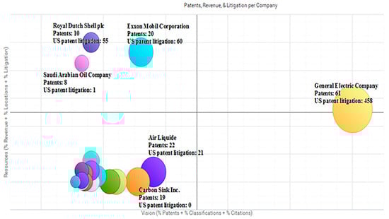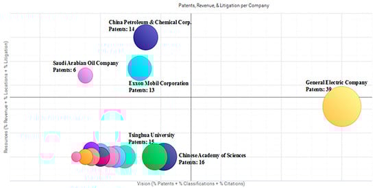 It is shown that, in the CCS domain of the U.S., the General Electric Company (GE) is the only assignee located close to the area of the upper right quadrant. Therefore, GE, not only has a competitive advantage over patent activities but also has a competitive advantage over resources, so that GE would be the technological and marketable leader with stronger comprehensive capabilities. Royal Dutch Shell plc, the Exxon Mobil Corporation and the Saudi Arabian Oil Company are located in the upper left quadrant, they have obvious competitive capabilities in resources, so they are challengers in CCS market and would also be the potential buyers. The other assignees are located in the lower left quadrant, they are the main patent assignees in the field of CCS and they would be not only niche players or start-ups but also the followers and market entrants. There are no assignees located in the lower right quadrant.