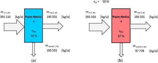 Equation (3) has been divided on both sides by time in order to receive material consumptions per unit of time. Before its optimisation, a material efficiency η4b of 50% has been estimated, resulting in material demand min 1.4b of 391,110 kg/a before its optimisation (see Figure 1a). After optimisation of this supply chain element by the waste reduction factor xw of 50%, the input material demand min 1.4a decreased to 293,333 kg/a. In Figure 1 mout 1.4a and mout 1.4b are equivalent because the example supply chain element is the last in the supply chain before the material is supplied to the aforementioned example manufacturing enterprise. For the upstream elements, the material demands calculated according to Equation (3) have been used for the required material output of the forerunners. Therefore the forerunner element number 3 of the supply chain 1 in Figure 1 after optimisation requires only 293,333 kg/a, instead of 391,110 kg/a before optimisation.