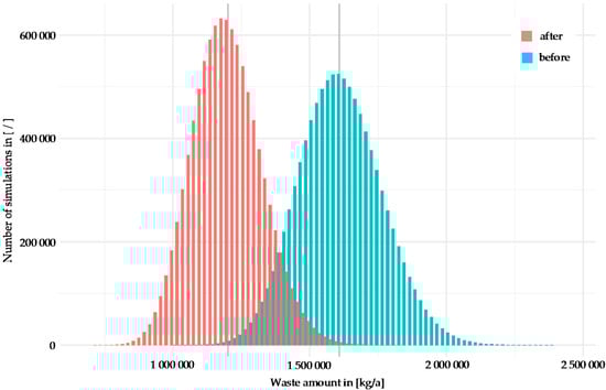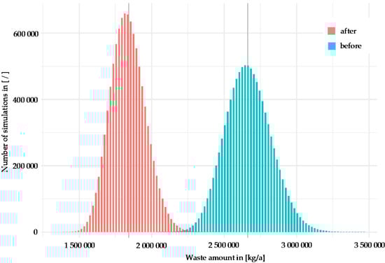 The mean value for the waste quantity before optimisation is approximately 20% above the value for the deterministic calculation results shown in Table 2. After optimisation this increases to approximately 25%. These differences arise from the aforementioned setup of the simulation, in which efficiencies are limited to 95%. The associated random variable of a deterministic variable with a value of 95% will range from 77.72% to 95% in the simulation, with a mean of 86.36%. This explains the observed loss of overall efficiency, while improvement factors contributed further to this effect. Taking the mean value before and after optimisation, the simulation shows a 44.57% waste reduction. The deterministic calculation based on the original assumptions resulted in a 34% waste reduction as stated above.