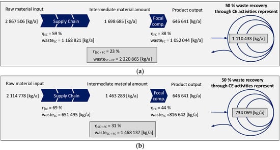 Circular economy networks need to be developed for the future. An effective extension of existing supply chains towards a circular economy requires a systematic change of technological and non-technological innovations. Together with the application of circular economy concepts, they can radically reshape life cycle value creation and drive fundamental changes across entire value chains, without restriction to specific sectors or materials [,,]. Therefore, investigations based on existing networks for the supply of material and products as described in Section 4.1 cannot be performed at this point of time for circular economy networks. However, it is possible to estimate the share of circular economy activities, assuming a certain future return factor from such actions. Based on the assumption that 50% of all wastes created in the supply chain and the focal company are reintroduced into the supply chain at the same value-added level, 1,110,433 kg/a of material can be returned through circular economy activities. This represents 39% of the material input for the scenario where no optimisation efforts are established within the supply chains and the focal company (starting point of the investigations).