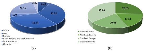 International migrant stock allocation by regions (a) and in Europe (b), 2015. Source: Own process based on United Nations, Department of Economic and Social Affairs (UN DESA) [27] data.