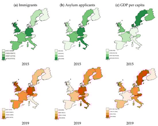 Number of immigrants (a); asylum applicants (b); and GDP per capita (c) levels in 2015 and 2019 (estimated) in European Union (EU)-10 receiving countries. Source: Own process of Eurostat [11], Organization for Economic Cooperation and Development (OECD) [28,29] and United Nations Databases/United Nations High Commissioner for Refugees (UNHCR) [12] data in Stata.