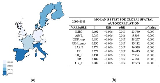 LM (Lagrange Multiplier) tests are significant for the entire sample (2000–2015), thus indicating the presence of spatial dependence. Rho reflects the spatial dependence inherent in the sample data, measuring the average influence on observations by their neighbouring observations. It has a positive effect and is highly significant for the 2000–2015 sample (Appendix A, Table A2 and Table A3). Moreover, we applied several panel unit-root tests that pointed out (in some cases) that non-stationarity might be an issue, especially for the 2000–2015 time series (Appendix A, Table A5a,b). As a result, for the study of immigration determinants, we used spatial lag models, along with SEM, estimated through the MLE, since the Ordinary Least Squares (OLS) estimators could be less efficient.
