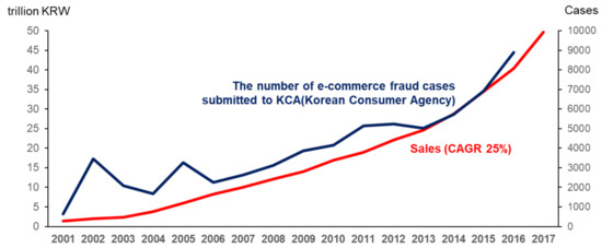 Trust plays a vital role in the sustainability of e-commerce transactions. The issue of trust is more critical in e-commerce transactions than traditional commerce transactions due to higher uncertainty [3]. According to PYMNTS and Signifyd—institutions that track and analyze fraud by examining the transactions of more than 5000 e-commerce merchants in Europe, North America, and Asia—total fraud increased 5.5% from Q2 2016 to Q2 2017, and the value of potential fraud was estimated to be 57.8 billion USD, as of October 2017 [4]. This implies that e-commerce fraud is becoming more serious, which may lead to consumer anxiety. According to research in 2016, respondents were asked, “How often are you afraid that you might be the victim of a fraud when buying products and services online?” Forty percent of the respondents said that they were afraid of e-commerce fraud to the extent of ‘always’, ‘very often’, and ‘often’ [5]. Seventeen percent of the respondents said that they had been victims of e-commerce fraud. This shows the level of concern over online shopping fraud in Finland in 2015 [5]. In the Republic of Korea, the Korean Consumer Agency (KCA) received 3261 complaints of e-commerce fraud in 2005 and 8881 complaints in 2016 [6]. Figure 1 shows the relationship between e-commerce sales and fraud cases. As shown in this figure, the number of the complaints of e-commerce fraud has been increasing, as the e-commerce market size increases in the Republic of Korea.