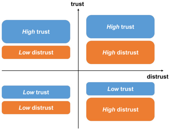 Others believe trust and distrust are distinct. Distrust does not necessarily mean a low level of trust. Trust and distrust are independent but linked, and distinct but coexistent [10,19,20]. Since Lewicki et al. [10] proposed a new view of separate, dimensional concepts, the traditional view of trust and distrust faces a bold challenge. A new view asserts that trust is not the opposite of distrust, they have ambivalence in common, and that they are separable [9,19,20,21].