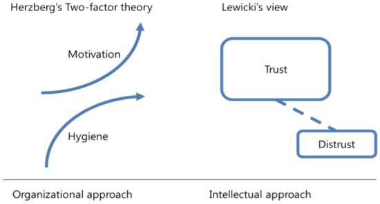 Figure 4 offers two views: the two-factor theory and the multidimensional approach of trust and distrust. As we follow Lewicki‘s view, it reminds us of Herzberg’s two-factor theory. Lewicki also considered Herzberg’s two-factor theory, but there are differences between the two models. First, Herzberg’s model is an organizational view while Lewicki’s model is an individual view. Second, Herzberg’s model is based on output evaluation, while Lewicki’s model is based on process evaluation. Herzberg tried to find certain factors in the workplace that cause job satisfaction and, thus, the theory explains the dual-factor causes of job satisfaction. While Herzberg’s model shows cause and effect, Lewicki’s model shows cause only. In Lewicki’s model, designed to explain how judgments are made, trust and distrust area activated independently [10].