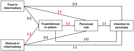 In e-commerce, perceived risk may act as an entry barrier. Contrary to a retail shop, in e-commerce, the potential buyer must make a decision armed only with information provided by a website. Trustworthiness of an intermediary with institutional operating systems is helpful in building up trust in the seller by reducing perceived risk [36]. Not only trust but also distrust can affect the perceived risk of the customer. In general, an e-marketplace operator (i.e., intermediary) provides an online marketplace where sellers and buyers can buy and sell goods and adjusts them to make transactions smoothly under the responsibility of the sellers and buyers. Therefore, all the problems that may arise in connection with the transactions between the seller and the buyer belong to themselves. Because of this characteristic, e-marketplaces have a high potential for opportunistic seller behavior and transaction uncertainty, which can act as a factor of distrust that can coexist with trust in a different dimension [45].