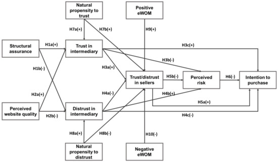 Trust and distrust affect purchase intentions in e-commerce [7,8,27]. Trust and distrust affect the willingness to purchase, intention to use, and willingness to share information [9]. Based on the above theoretical observations, potential buyers’ perceived risks affect their intention to purchase. We need to consider both trust and distrust of the intermediary and the seller as antecedents to perceived risk and intention to purchase. Along this line, we propose the following nine hypotheses: