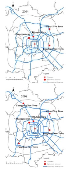 - Sun, T.; Wang, L.; Li, G. Distributions of Population and Employment and Evolution of Spatial Structures in the Beijing Metropolitan Area. Acta Geogr. Sin. 2012, 67, 829–840. (In Chinese) [Google Scholar]