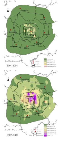 First, the spatio-temporal change in the transaction price of residential land in Beijing is large. The unit price of residential land rose after 31 August 2004, particularly after 2008. The change in land price distribution is obvious: (1) The circle structure weakened, and (2) The distribution of land price became more scattered. These changes reflect that the city center’s influence on residential land price weakened.