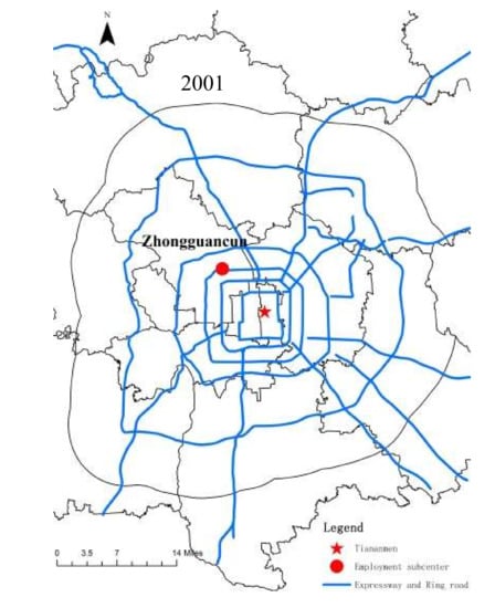The purpose of research on urban spatial structure is to solve problems in urban development. Beijing, the capital city, is a typical case of China’s urbanization. Urban sustainable development was beset by numerous problems, including traffic congestion, air pollution, soaring land prices, and a lack of affordable housing due to the over-aggregation of population and economic activity in the city center [17]. In order to solve these problems, the government of Beijing has formulated many planning policies since the early 1990s to promote its transformation into a polycentric structure [7]. The consequent emergence of employment subcenters during the past decades has fundamentally reshaped and restructured the urban spatial structure of Beijing [7,17,18,19]. While some studies have examined the effect of employment subcenters on population distribution [7,18], a number of problems remain for investigation. First, can employment subcenters affect the surrounding area and even the residential land price of the whole city? Second, can the main center continue to influence residential price? The purpose of this paper is to address these empirical questions, using residential land price variations and a Hedonic model to examine the impact of the emerging employment subcenters on residential land values. It is hoped that the results gleaned will be useful for urban planning and management in the future.