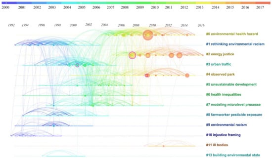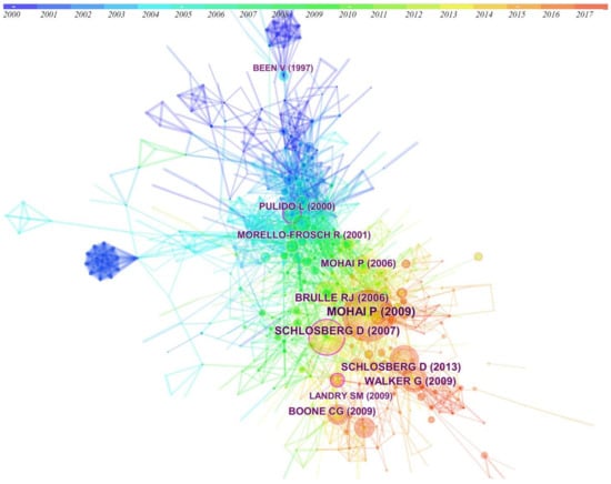 Finally, Schlosberg [11] is responsible for the most recent paper to have a significant co-citation impact within the EJ domain. Schlosberg notes the continued expansion of EJ discourse boundaries, both vertically (geographic scale) and horizontally (topical) (also see [60]), highlighting the explicit consideration of individuals, communities, and the expansion of EJ to non-human entities. Specifically, research prospects related to climate change (climate justice) and sustainable materialism (sustainable living) are conceptualized as new forms of EJ scholarship, and are examples of how EJ has expanded horizontally. The EJ discourse can also be seen as expanding vertically when considering the increase in attention to the global nature of EJ topics. This movement is evidenced by new research that crosses national and international boundaries, and includes water rights, gold mining, and pesticide drift [60]. Although this has been covered previously (e.g., [22]), Schlosberg’s take organizes the research well and provides several prospects for future work. The article demonstrates the breadth of EJ and its progression in developing underlying causal mechanisms, as well as detailing the many new ways of understanding both the “environmental” and “justice” aspects of the domain.