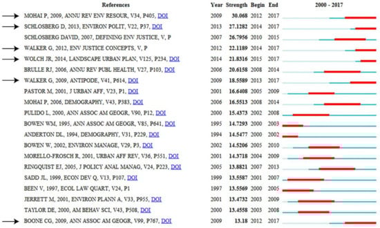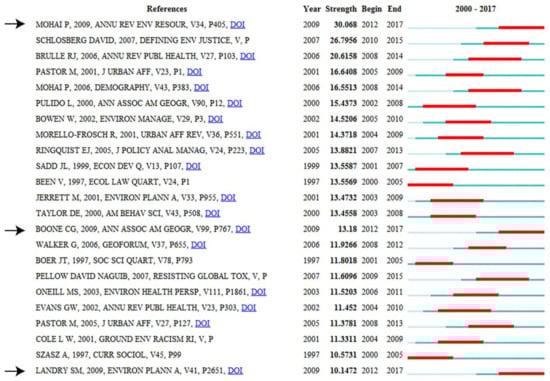 We begin by examining the citation bursts of articles that were especially strong and enduring. These articles can be seen as a representation of major milestones within the EJ knowledge domain. Articles with a sustained strong citation burst are those that tend to make a large contribution to the field, and continue to do so for the length of their burst. Figure 2 highlights the articles with burst levels over 10 and a sustained burst of at least five years. Several of the articles highlighted in Section 3 have also made this list, further demonstrating their importance to the EJ knowledge domain in the 21st century. The articles noted with arrows on the left hand side have a strong burst level that has been sustained through 2017. The burst metric suggests that Mohai et al. [52] and Boone et al. [56] continue to be influential, but so too is Landry and Chakraborty [61], which explores the inequalities related to desirable land uses and environmental amenities.