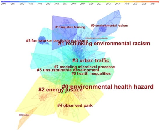 The network itself (Figure 1) is fairly dense, but it does show how the field has progressed from 2000 onward. The emergent clusters are well-defined in both Figure 1 and by the associated diagnostics (e.g., silhouette values) in Table 3. There is some overlap between clusters, which makes logical sense. Many papers are relevant to a variety of EJ specialties, some of which are active concurrently. Moreover, regardless of what the substantive topic may be, the idea of inequality, as it relates to race, remains a defining characteristic for the field. There will be, of course, some overlap in the substantive focus of the research. Indeed, as mentioned previously, the first term for every cluster found in Figure 4 was “environmental justice”, which implicitly means that each of these topics has some focus on the inequalities between different social groups. However, when comparing the results of the EJ knowledge domain to other fields, such as geographic information systems [13] or medical informatics [68], our results suggest that EJ has evolved in a relatively sequential manner: a particular cluster emerges, then declines as another emerges. This is a compelling temporal footprint, and is evidence of a quickly evolving field.
