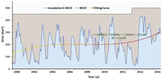 The time series of inundation area and non-flooded area in the Danjiangkou Reservoir WLFZ based on remote-sensing monitoring from 2000 to 2016 is illustrated in Figure 3.