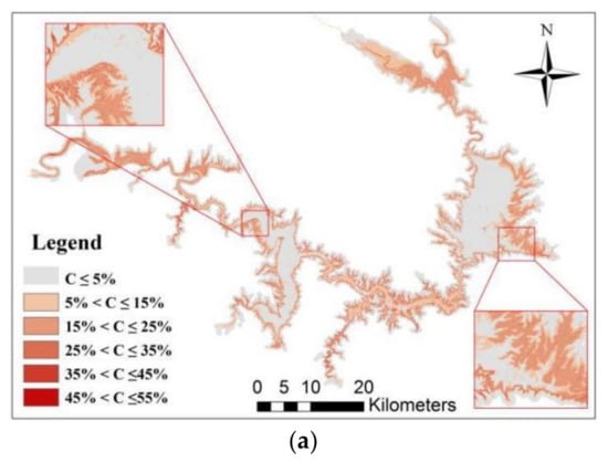 To show the diversity between grid cells more clearly, the degrees were reduced to four levels by from 10% to 90% in Figure 5. In total, the shorter the distance between the grid cells and the permanent surface is, the smaller the value tends to be. Two representative areas were selected, and the frame enlarged: Junxian County, where the relocation area of the ancient Junzhou City was flooded, at the top-left, and Taocha, the first sluice gate and the head of the main canal of the middle route of the SNWD project, at the bottom-right. Comparing the areas of scope during the period before water diversion reveals that those after water diversion have shown a significant increase in permanent water area (i.e., 90% < ≤ 100% or dark blue region) and potential inundation area (i.e., = 0 or gray region). The formerly tortuous, fragmented bays was submerged, becoming a continuous expanse of open water. In the northern part of the reservoir, nearly 65% of the seasonally flooded areas were completely submerged. Accordingly, the permanent water increased by 169.60 km², and the potential inundation area increased by 202.87 km².
