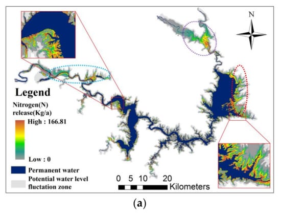 is the potential release amount of N or P elements, is N or P element type, is the edaphic weight in the WLFZ unit (here, only the plowing layer (i.e., 20 cm) is considered), is the background content of TP or TN, and is the proportion of the N or P released to the overlying water (here, referring to the results of the laboratory experiments of the soils in Danjiangkou Reservoir’s WLFZ [32], the of N is 1.2% and the of P is 0.47%).