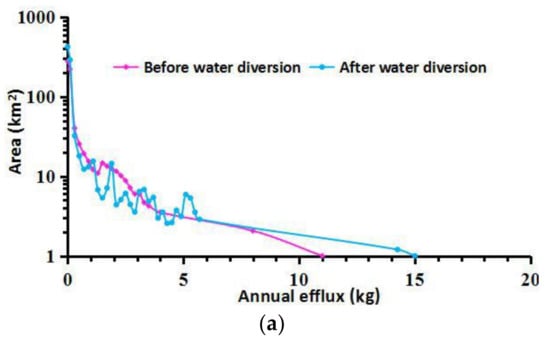 The annual N and P release amounts were relatively limited for each 30 × 30 m soil unit in the Danjiangkou Reservoir WLFZ. The areas of soil units with different N and P annual efflux in the WLFZ was calculated in Figure 10. Before water diversion, the P release amount was less than 2.3 kg per year in 94% of the WLFZ soil units and the N release amount of nitrogen was less than 50 kg per year in 81.8% the WLFZ soil units. After water diversion, the proportion of soil units with the same annual release amount of P and N as the total WLFZ area decreased to 84.9% and 79.8% respectively. The release amount of P and N annually during the two periods before and after water diversion in the Danjiangkou Reservoir WLFZ was estimated. The release amounts of P and N reached 6.0 tons and 196.9 tons, respectively, per year before 2014, and increased to 7.6 tons and 301.2 tons, respectively, after 2014.