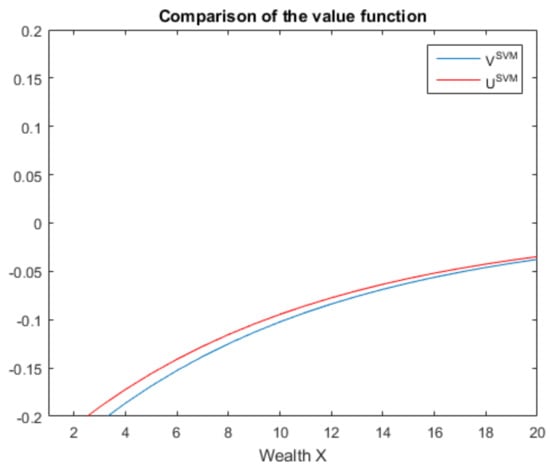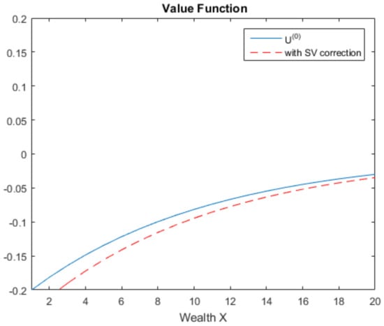 According to (57) and (79), we get the solution of , and also the fast modification term of , we then calculate the utility term as . The approximations to the value functions are plotted in Figure 1 and Figure 2.
