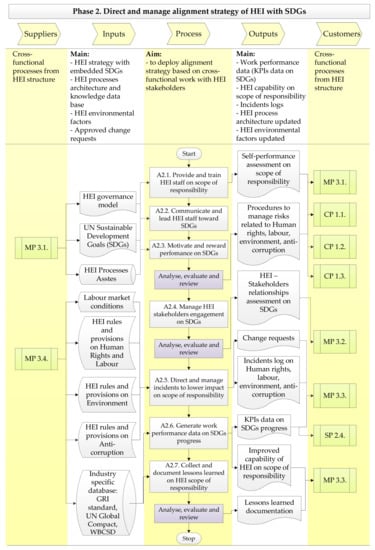 The phase uses main outputs of the phase 1 and considers the approved change requests issued while work is performed, and also relevant factors from HEI which may hamper the implementation of alignment strategy with SDGs. The processes responsible for delivering these inputs are: MP3.1. Planning value chain and operations and MP 3.4. Quality assurance and improvement, from the Management Process Group (Table 2).
