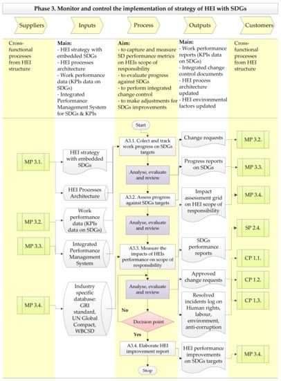 The phase is fed by all the outputs of the phase 2 such as work performance data on KPIs, integrated performance management systems for SDGs and KPIs, and also HEI processes architecture and the approved alignment strategy with SDGs. This information is delivered by the Management Processes Group in charge with planning, monitoring and controlling, and quality assurance (i.e., MP 3.1., MP 3.2., MP 3.3. and MP 3.4.) from the cross-functional structure of HEI (Table 2).