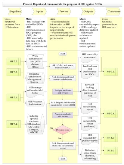 The phase uses outputs from phase 2 and 3, and work performance data with KPIs on SDGs and HEI communication on progress (COP) plan. The strategy of HEI with embedded SDGs and specific processes should be also considered by the process architect. This information is delivered by the Management Processes Group in charge with planning, monitoring and controlling, and quality assurance, which has a key role in ensuring that reporting and communication processes are in line with widely accepted principles and best practices performance indicators as GRI guidelines [,].
