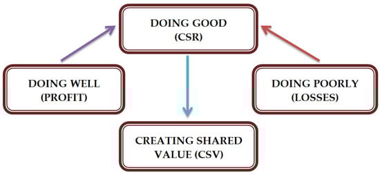 Figure 1 is a graphical representation of the objective of our article, profit and loss influenced the CSR activities, and the fact that CSR leads to the Creating Shared Value (CSV) concept of Porter and Kramer [] which is a strategy regarding the positive relationship between company and society, and CSV tends to replace CSR in the future.