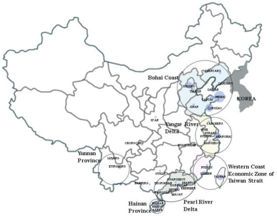 The Chinese golf destinations were divided into seven regions (Figure 1) according to their characteristics: Bohai Coast; Hainan Province; Pearl River Delta; Western Coast Economic Zone on the Taiwan Strait; Yangtze River Delta; Yunnan Province; and other [8,73]. The selected destinations attract Korean golf tourists in different ways based on their resources, including geographical, cultural, and other factors. The Chinese literature and in-depth interviews with Korean golf travel agencies support the geographic classification for this research, but this grouping also needs to be verified by tourists’ descriptions of the regions. Supply-side sources provide information on the quality and quantity of golf courses, geographical proximity, and climatic advantages, but tourists’ narratives may reveal important social and cultural criteria for destination classification.
