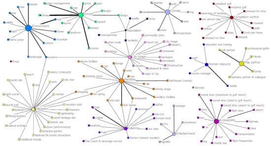 Cross-domain characteristics were analyzed though 10 overlapping headwords, including sea (overlapping in course and environment); design (course and reputation); scenery (environment, city image, and attractions); shopping and hot springs (attractions and facilities); mini club, club house, and restaurant (facilities and catering); hotel (city image and facilities); and familiarity (reputation and city image). Sea was present in the course and environment attributes with frequencies of 23 and 340, respectively, and may indicate Korean golfers’ desire for variety and novelty. For Korean golfers who are used to inland mountain golf courses, seaside courses may enhance satisfaction due to their novelty. Petrick [53] found that golf tourists, especially younger golfers, pursued novelty for a “change from routine, surprise, thrill, and boredom-alleviation.”
