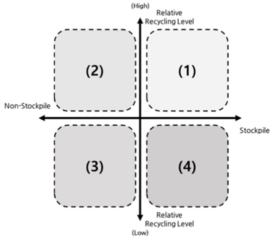 Some countries, including Japan, Korea, and the USA, have adopted two major policies to lower RM supply uncertainty. One is to operate an RM stockpile system at the national level, and the other is to impose more legal responsibility on producers to recycle waste. First, the RM stockpile system aims to relieve the fluctuation in RM prices. With the RM stockpile system, some RMs are stored in the government’s repository when the market price is stable. Later, if the market price increases rapidly, the stored RMs are sold to manufacturers at a lower price. Second, Extended Producer Responsibility (EPR) requires producers to accept a duty to recycle RMs, and pay recycling charges when this duty is not fulfilled. The purpose of this policy is to encourage eco-friendly production as well as sustainable manufacturing by minimizing the impact of supply uncertainty and raising the circulation ratio [5].