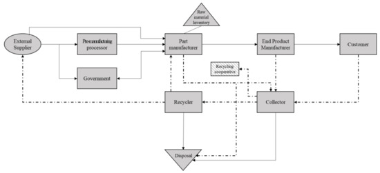 To overcome the difficulties in supplying RMs and achieve sustainability in the supply chain, one effective method is to recycle them domestically. Meyer and Bras [11] addressed the reasons to recycle RMs and investigated the possibilities and difficulties of recycling RMs on an industrial scale. The results showed that large-scale recycling lines were required for economic benefits to be realized. Rademaker et al. [20] evaluated the historical annual flows of neodymium and dysprosium and estimated their future flows. This study indicated that the demand for recycling RMs will increase sharply in the long term, and RM industries must develop recycling technology and infrastructure. In addition, EPR and waste electrical and electronic equipment (WEEE) can be considered other effective ways to achieve supply chain sustainability. Several studies analyzed the impact of these policy regulations on producers’ performance in managing the supply chain [21,22,23,24].