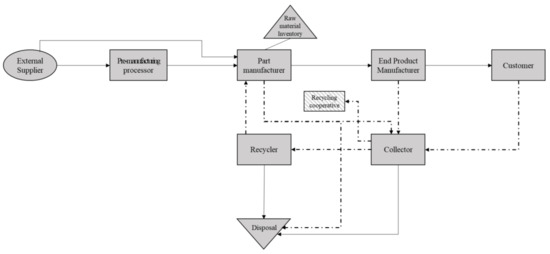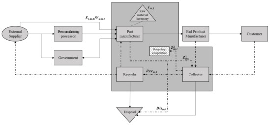 If an RM is designated as a target material by EPR, the manufacturer can fulfill the recycling duty by either recycling the related objects or paying the sharing cost to the recycling cooperative. If the manufacturer decides to use both methods, the recycling charges are deducted from the sharing cost of the recycling cooperative. Some manufacturers let the recycling cooperative fulfill the recycling duty and pay the sharing cost instead of recycling the scraps. This paper considers both the recycler and the recycling cooperative in the CLSC planning model of RMs. However, although handing over the scraps to the recycling cooperative fulfills the EPR obligation, some problems arise when those RMs are not circulated in the CLSC of RMs after the scraps are sent. Therefore, in this research, the recycling cooperative is included in the supply chain diagram, but it is not considered a supplier type.