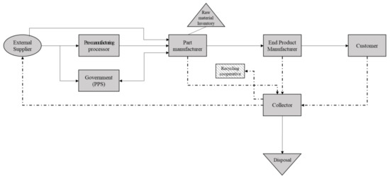 Therefore, for producers using RMs as the raw materials for their products, it is necessary to consider all the conditions mentioned above when developing supply chain planning. To achieve this, the current supply chains must be analyzed and represented precisely in a diagram. For example, the government (Public Procurement Service and Korea Resources Corporation) can be an alternative supply route for producers using the stockpiled RMs, and this route can be open or closed depending on the external environment in terms of price fluctuations or market demand. Additionally, different supply chain structures are formed for producers who do not meet their recycling duty, or producers who cannot recycle.