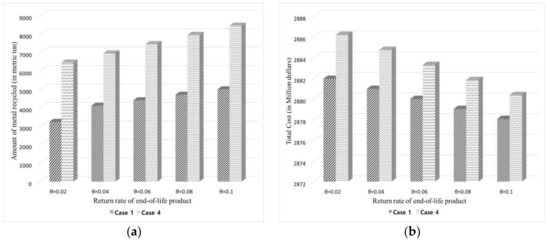 Through sensitivity analysis we were able to draw some meaningful insights. First, this study found that setting the appropriate sharing cost when considering the recycling cost is an important factor in promoting the manufacturer’s recycling. Additionally, it was confirmed that a high return rate positively affects the amount of recycled RMs and the total cost reduction for the part manufacturer. Thus, the manufacturer must raise the return rate in the long term by making a contract with a number of collectors to guarantee the collection of used products. Furthermore, the EPR recycling obligation plan established by the government was a light burden on manufacturers at the beginning of the planning horizon. After that, designing the plan to rapidly increase the burden was a way to reduce the total cost and increase the total amount of recycled RMs in the CLSC of RMs. It is also necessary to consider ways to provide different incentives by dividing the achievement level of recycling obligations by segment.